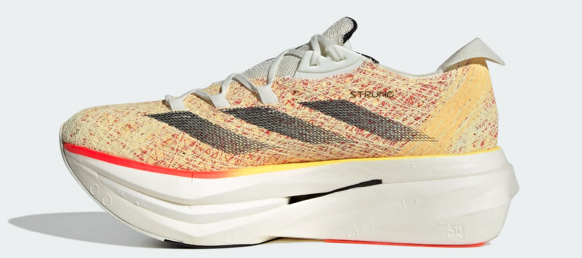 Skoene er konstruert med en STRUNG-overdel, en tekstilinnovasjon som omdanner data fra utøvere til et dynamisk materiale skreddersydd for utøverens behov. STRUNG-overdelen er grundig utformet med lagvis forsterkning i kritiske områder som mellomfoten og hælen, i tillegg til målrettet fleksibilitet i forfotens utvidelsessoner. Den strikkede pløsen er designet for å sikre en trygg og stabil følelse.