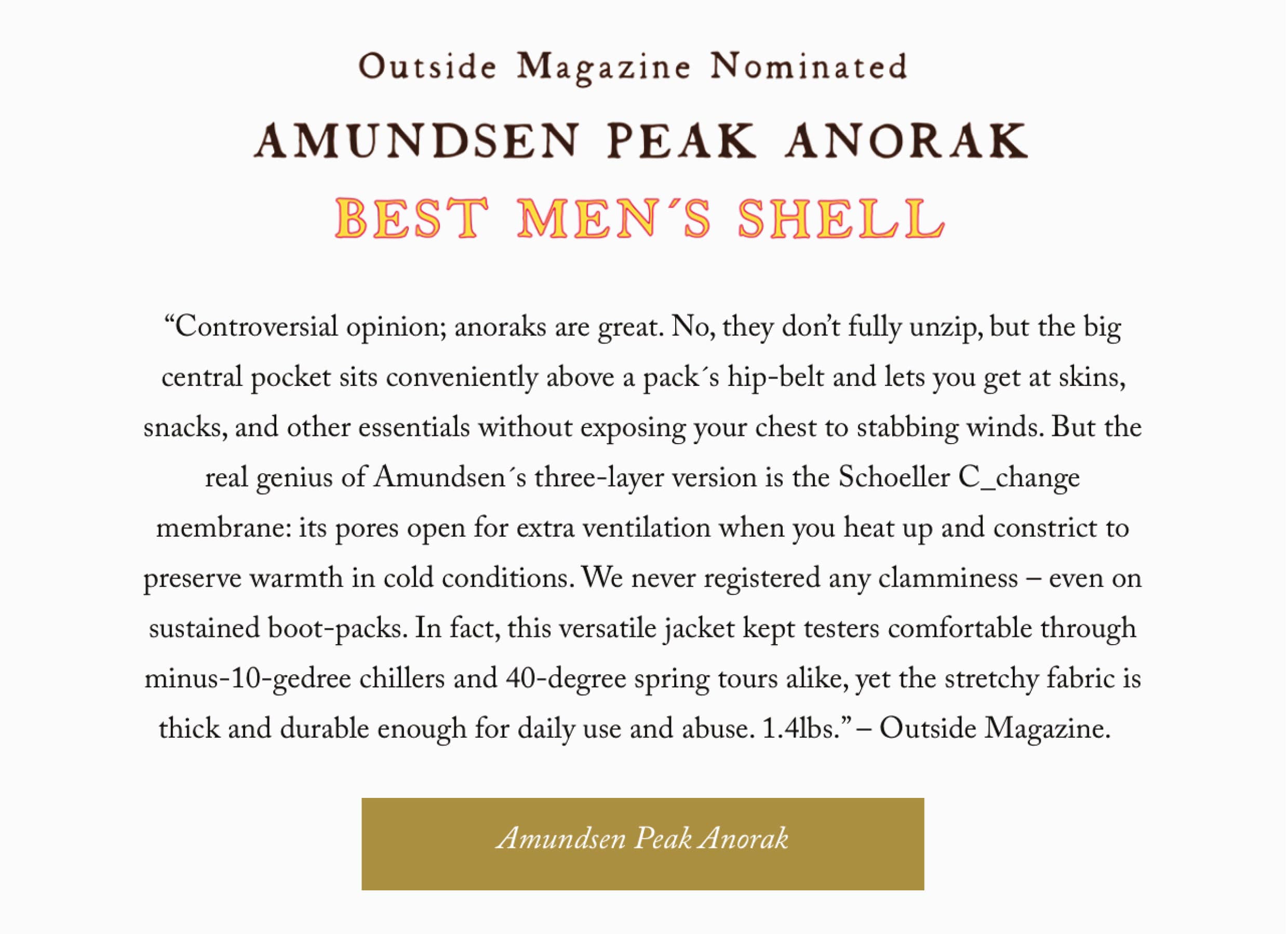 Peak Anorak er en del av "The 3-Part Formula", et nytt og annerledes konsept for å kle seg optimalt for toppturen, skituren eller fjellturen. 3-Part er et integrert system av anorakk/jakke, nikkers og gamasjer. Konseptet ble til som et direkte resultat av gründernes egen ekspedisjon til Antarktis i 2011, der klærne og konseptet ble testet i sitt rette element. 3-Part Formula tilpasser seg alle værforhold, og sørger for ekstrem fleksibilitet. Rett og slett en evolusjon av tradisjonelle turklær!