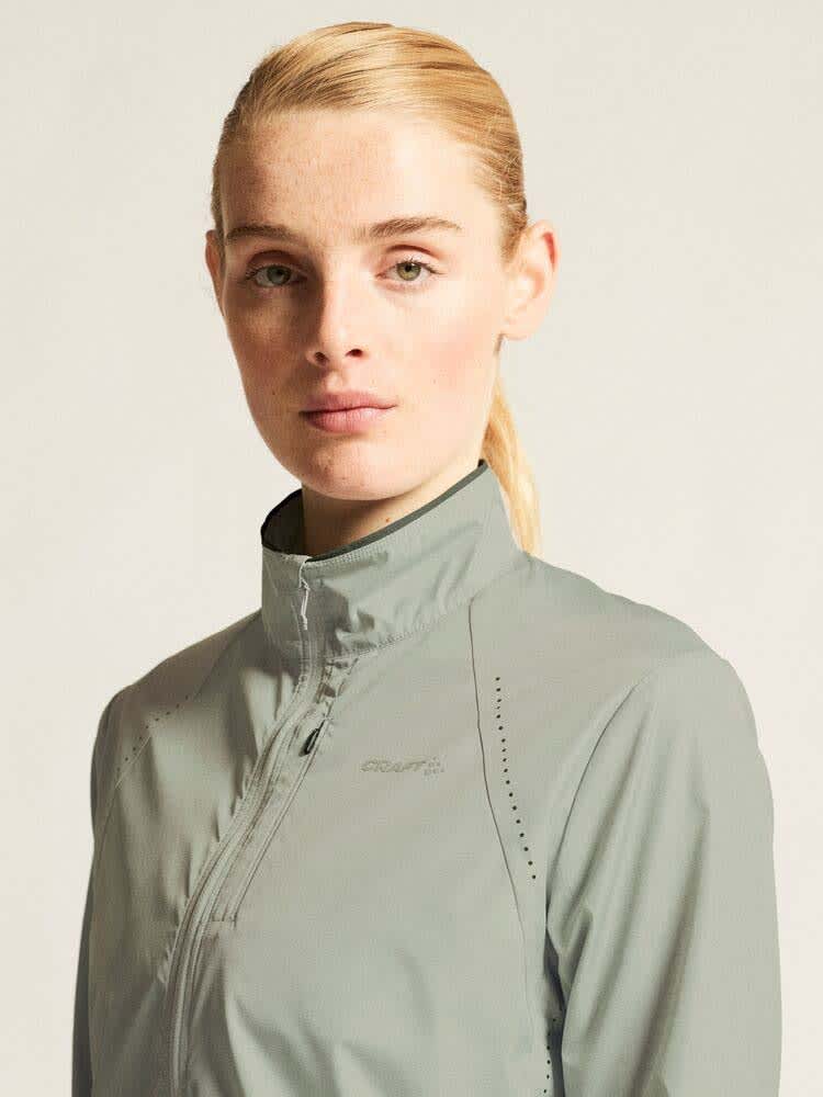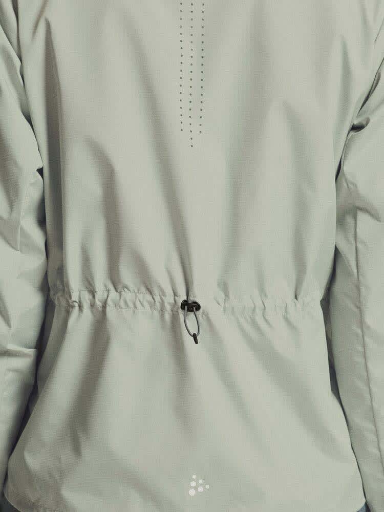 Jakken er laget i lett ripstop-stoff av 100 % resirkulert polyester, som transporterer fukt effektivt og holder deg komfortabel under vindfulle og lett fuktige forhold. Strategisk plasserte perforeringer midt på ryggen, under armene og på skuldrene gir optimal ventilasjon når intensiteten øker. Justering med snøring i midjen og nederst sikrer en feminin og tilpasset passform, mens elastiske ermeavslutninger hindrer trekk.