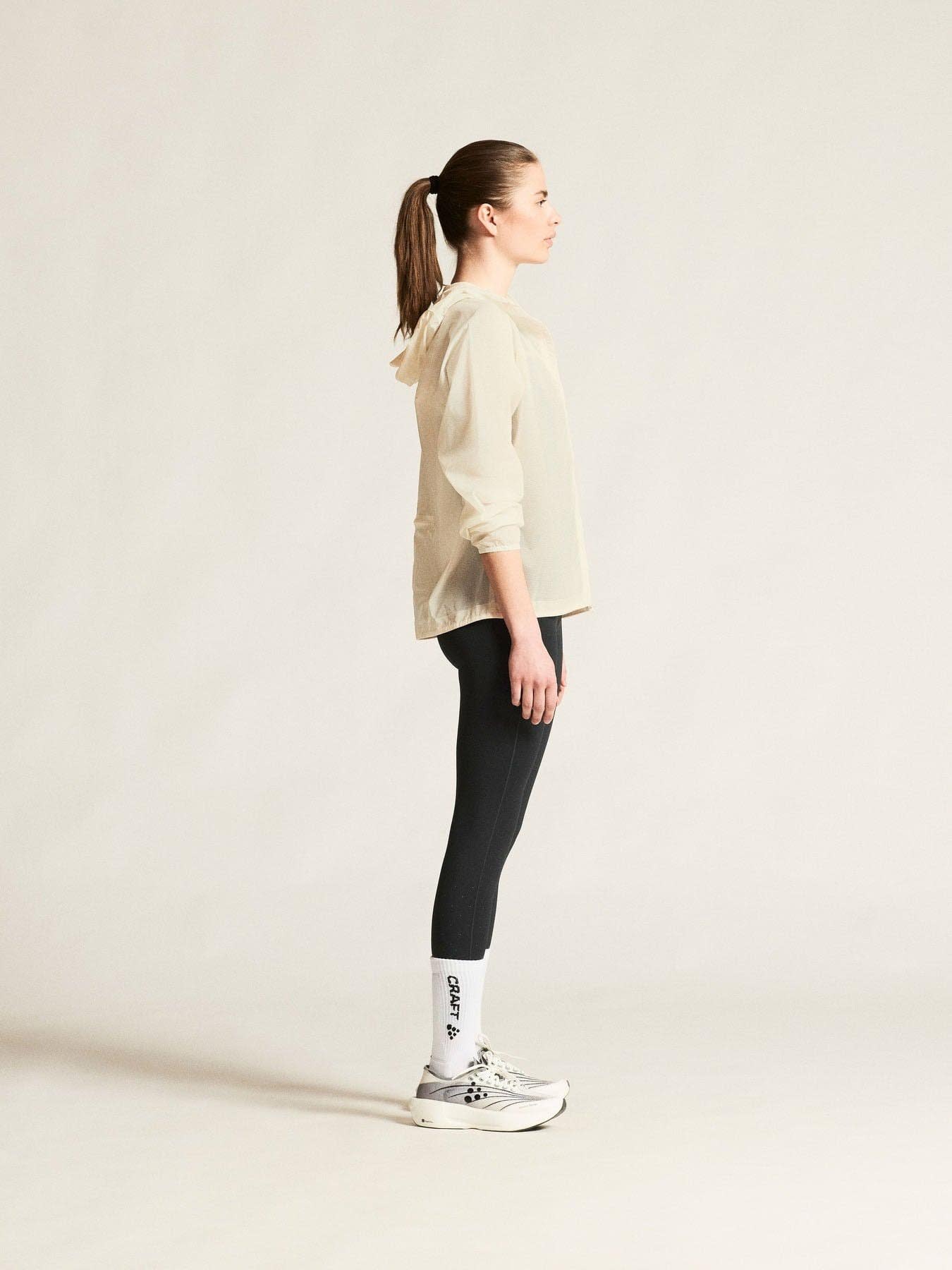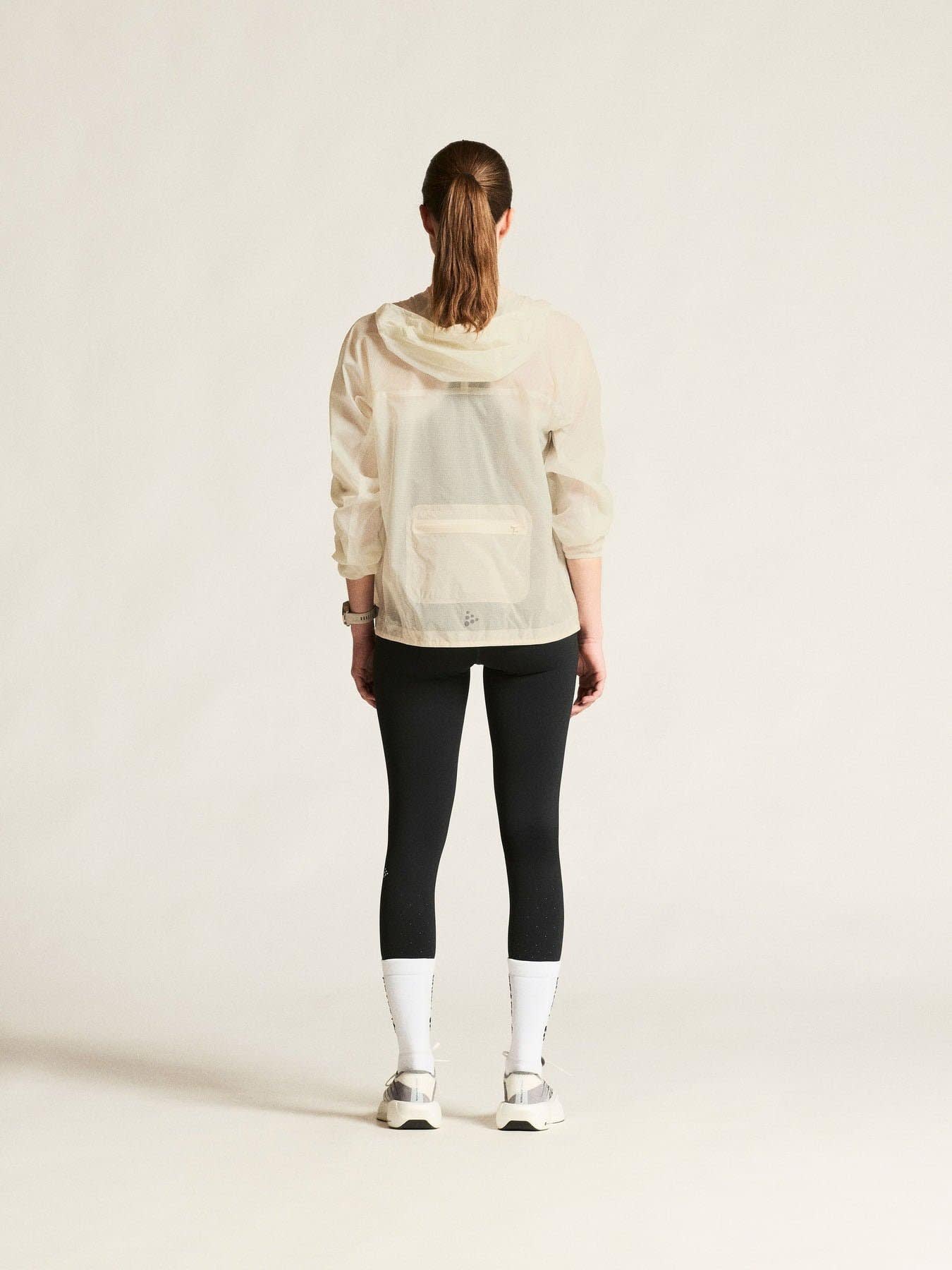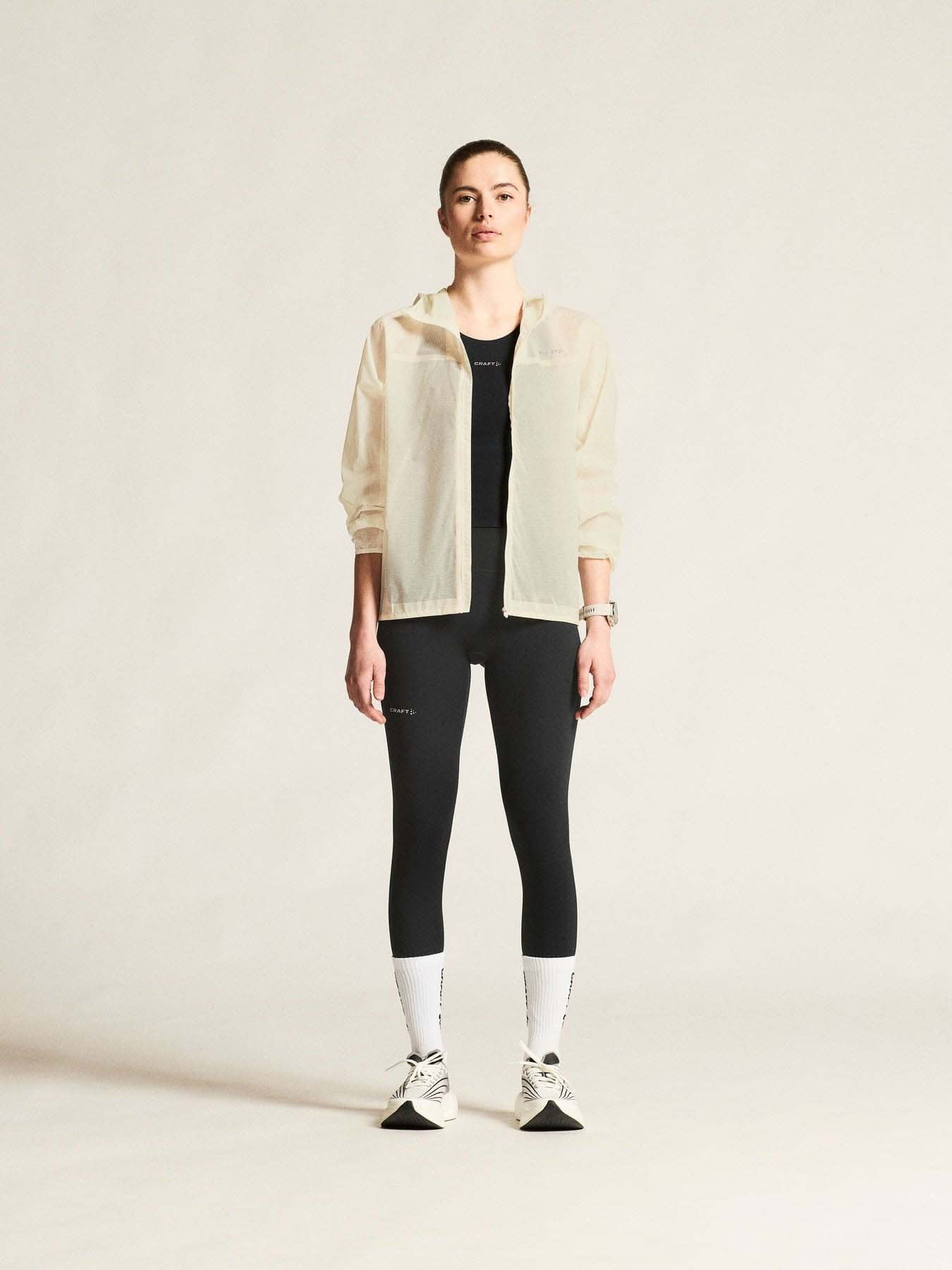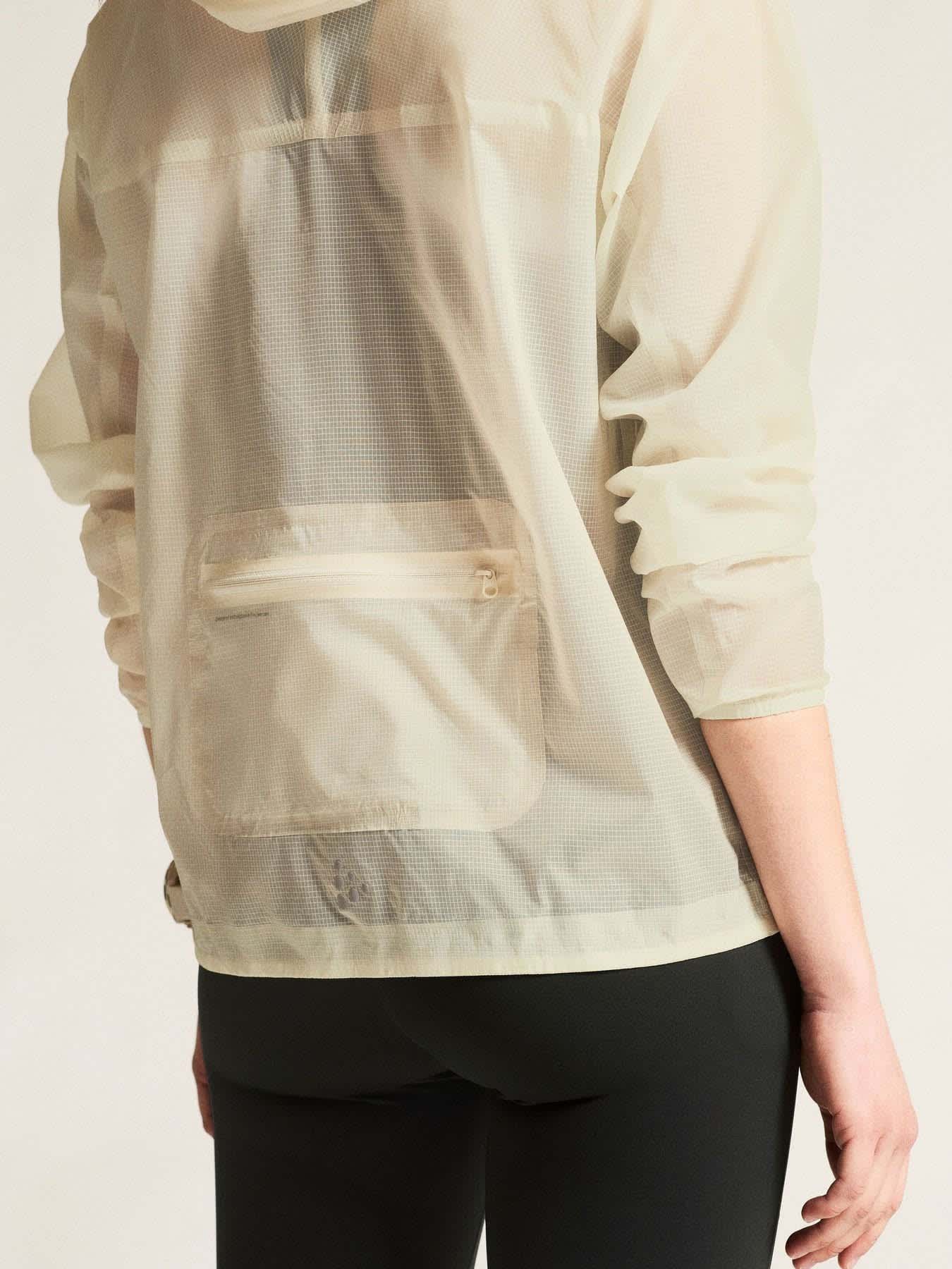 Produsert i 100 % resirkulert polyamid, gir det tynne ripstop-stoffet både vindbeskyttelse og vannavvisning, samtidig som det effektivt transporterer fukt og holder kroppen komfortabel under hele treningsøkten. Sammenføyde sømmer og elastiske kanter forbedrer passformen og beskytter mot vær og vind, mens flere glidelåslommer gir praktisk og sikker oppbevaring av nøkler, energibarer og mobil.