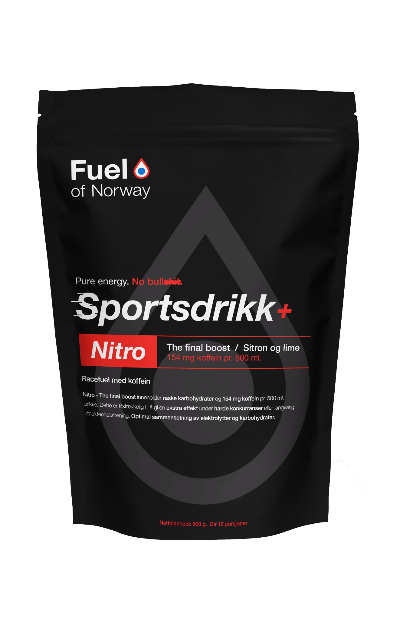 Fuel of Norway Nitro er en pulverbasert drikk med koffein til bruk under konkurranse og tøffe økter. Dokumentasjonen om den prestasjonsfremmende effekten til koffein er stadig blitt større og det er ingen tvil om virkningen. Riktig inntak av koffein i konkurranser gir 3-5% forbedring i prestasjonen. Utholdenhetsutøvere har i lang tid eksperimentert med ulike blandinger av rask energi(sukker) og koffein. Dette har ofte vært rene heksebrygg uten å riktig vite hvilke mengder av koffein og energi som faktisk inntas og for mange kommer dette rett opp igjen etter inntak. Mest kjent har kaffe og Cola blandingen vært. Vårt mål var å lage en drikke som gir utøveren full kontroll på inntaket samtidig som mengden koffein er så stor at man får effekt. Vi jobber videre med grunnprinsippene om naturlige ingredienser og god smak. Nitro er lettdrikkelig og nesten nøytral i smak. Dette er fordi man skal klare å drikke dette når man også er ekstremt sliten. Nok en gang har vi tatt utøverens behov på alvor og laget et unikt prestasjonsfremmende produkt.