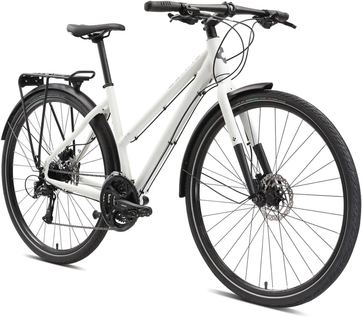 Sykkelen er basert på bestselgeren Flow, men vi har satt den opp med støtte, skjermer og bagasjebrett for praktiske bruksegenskaper. Sittestillingen er utviklet for å gi et effektivt tråkk med lav belastning på nakke og rygg, og samtidig sørge for at du har et godt overblikk over trafikken. Shimano 24-girs drivverk gjør at du alltid har et gir som passer enten du trekker barna i tilhenger eller er på langtur med bagasje.