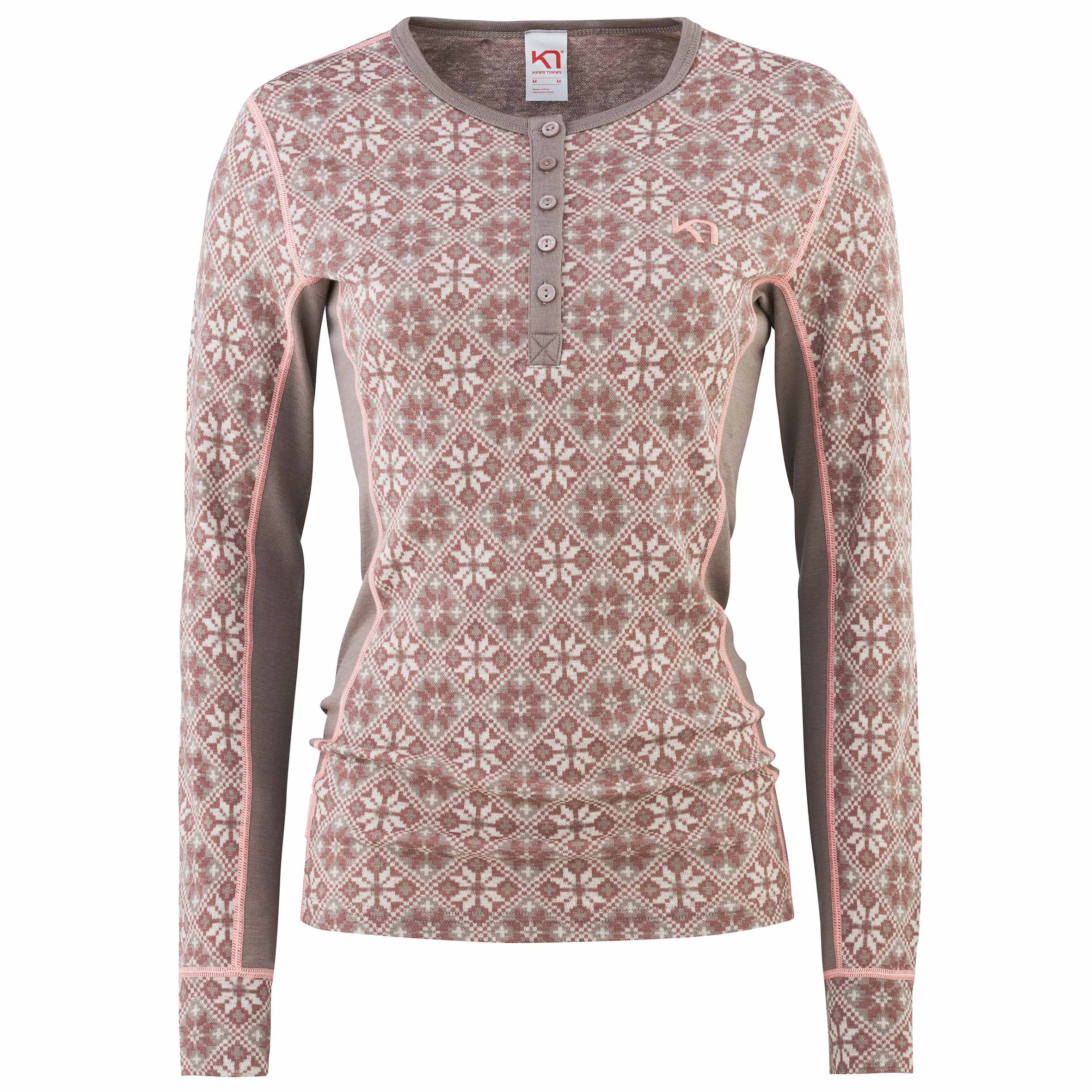 Et ikon for den skandinaviske vinteren. Rose LongSleeve er en ulltrøye for kvinner, med knappeåpning i halsen og 100% Merinoull. Overdelen har et stilig, feminint og Nordisk-inspirert blomsterdesign, i en slank, sporty silhuett.