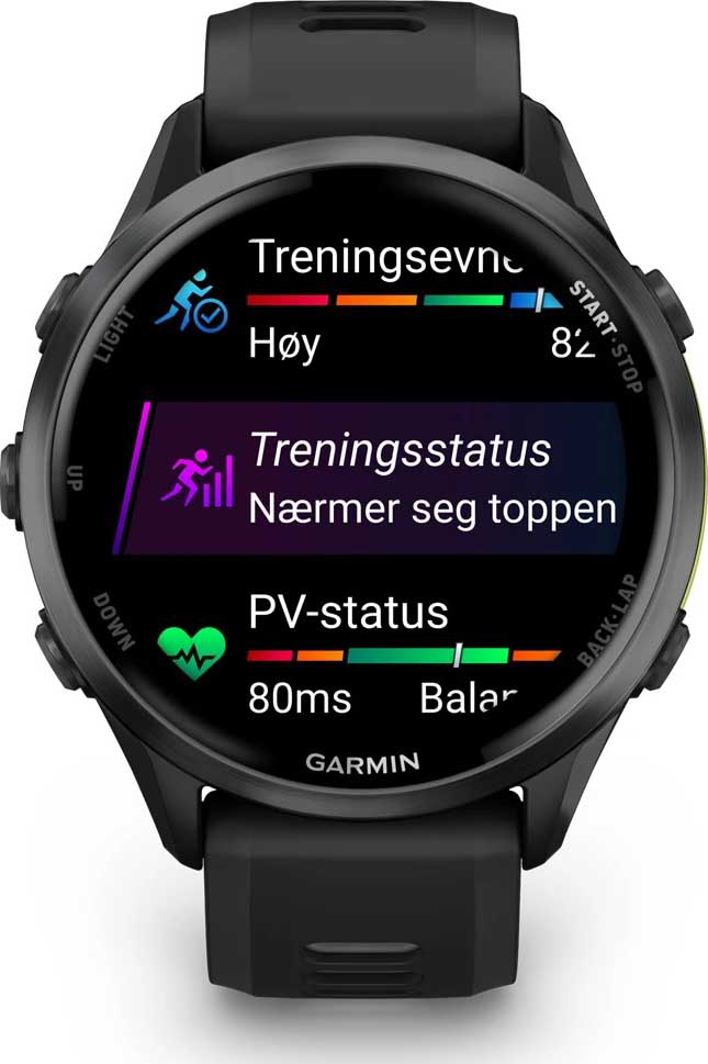 - Training Readiness: Fra det øyeblikket du våkner, får du en poengsum for treningsevne basert på søvnkvalitet, restitusjon, treningsbelastning med mer, slik at du kan avgjøre om det er en god dag å trene hardt på – eller å ta det rolig på.