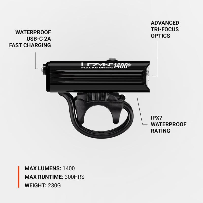 Macro Drive 1400+ gir en kraftig lysstyrke på 1400 lumen gjennom Tri-Focus Optics, som skaper et optimalisert lysmønster for overlegen synlighet på stien eller veien. Den vanntette USB-C ladeporten og 2A+ hurtigladefunksjonen gir praktisk lading (kabel ikke inkludert), mens CNC-maskinert aluminiumskonstruksjon med kjøleribber sikrer holdbarhet og effektiv varmeavledning.