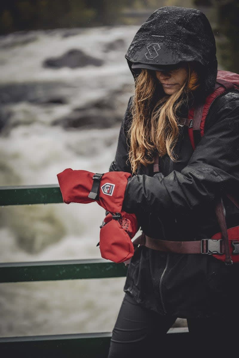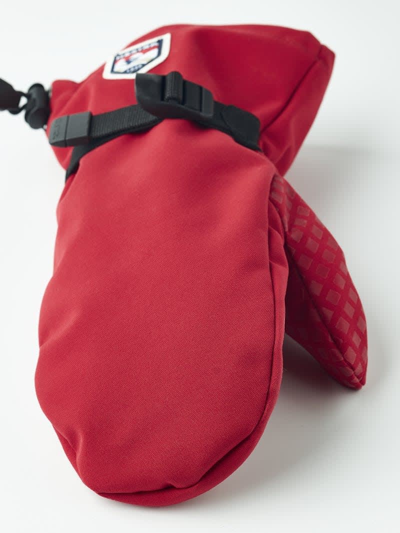 Den har regulerbar rem med spenne rundt håndleddet, strikk nederst på kanten og snølås. Mønsteret i håndflaten gir et bedre grep.