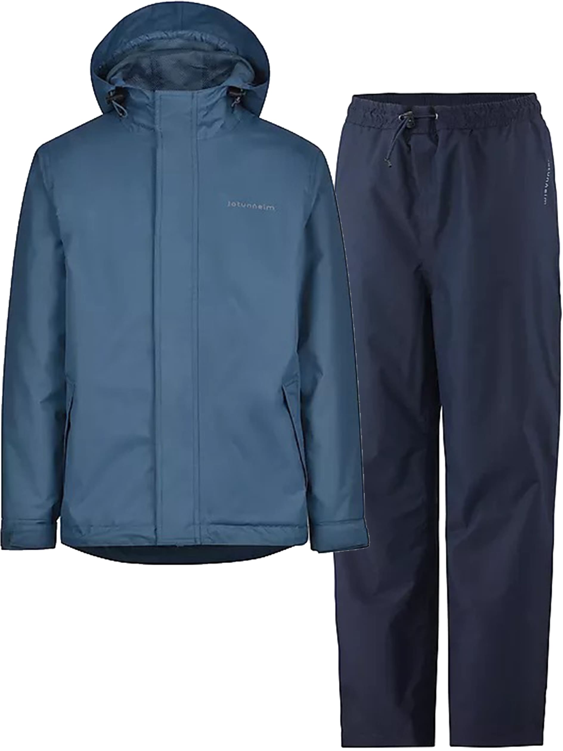 Lett regnsett for tur og fritid. Polyester Rip Stop for ekstra slitestyrke, vanntett og vindtett med 8000 mm vannsøyle og teipede sømmer. Jakken har fast hette med snorstramming og stormklaff i front. Buksen har strikk i livet og borrelåsjustering nederst på bena. Leveres i praktisk nettingpose.