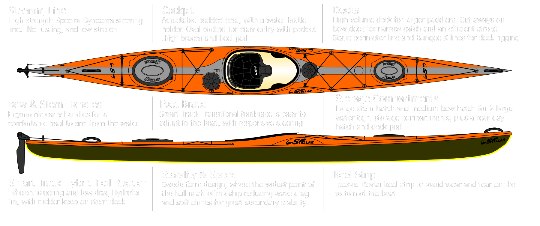 Designet av den vellykkede S18, med optimert konstruksjonen for påkjenningen av ekspedisjons-padling, samtidig som den har beholdt skrogeffektiviteten. S18 Exp kommer med en dagluke og baugdekkluke for å gjøre det enkelt å hente utstyr mens du padler. S18 Exp har en ny kraftig konstruksjon, MultiSport Expedition, tatt fra vår slitesterke og populære Multi-Sport lay-up som gjør denne båten til den mest robuste båten til Stellar. En standard Kevlar Keel stripe på skroget gir ekstra beskyttelse mot det du kan møte på dine reiser. Denne båten gir deg det du trenger for at du enkelt og trygt kan tilbakelegge milene.
