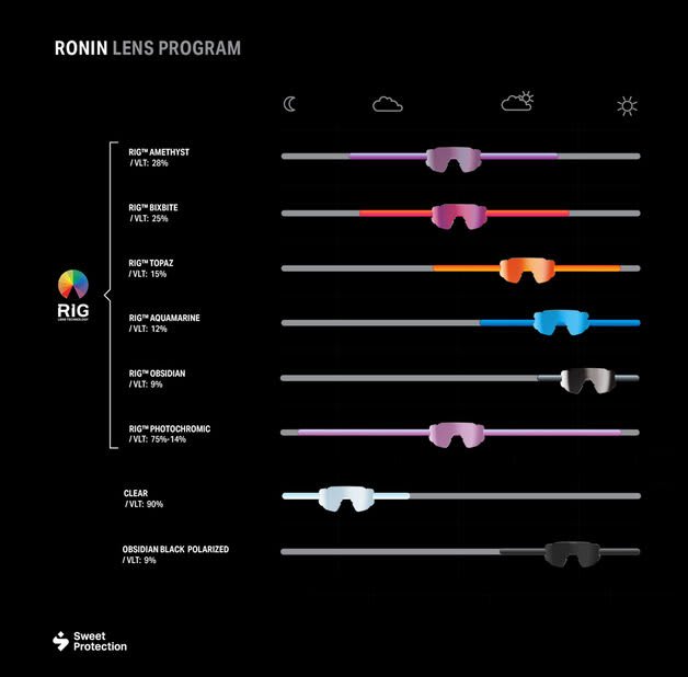 RIG® linseteknologi utviklet av Sweet Protection for å gi kontrastforsterkende syn med minimal fargeforvrengning med redusert øyetretthet 2.2mm torisk linse med ekstrem støtmotstand Super oleophobic- og hydrophobic belegg 100% UV-beskyttelse Enkelt linsebytte Ekstremt synsfelt TR90 polyamid ramme. Slitesterk og lettvekt TPR innstøpte myke og lettgripelige innsatser på brillestavene for ekstra komfort og sikkerhet